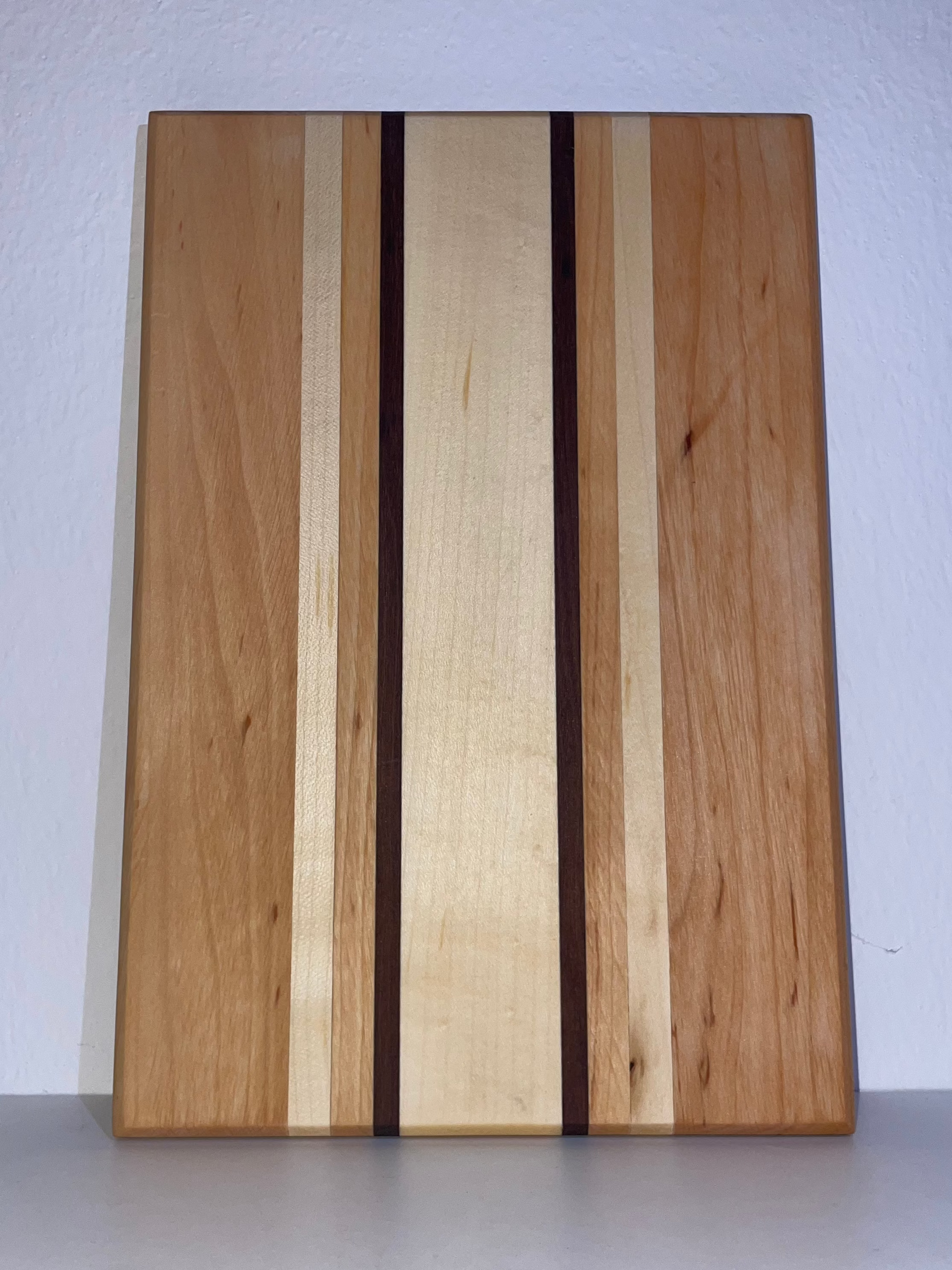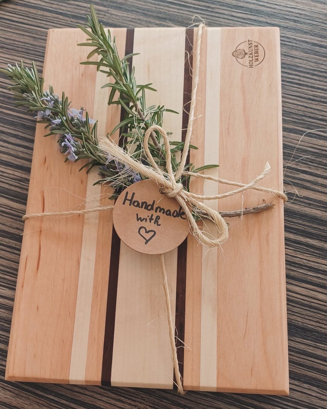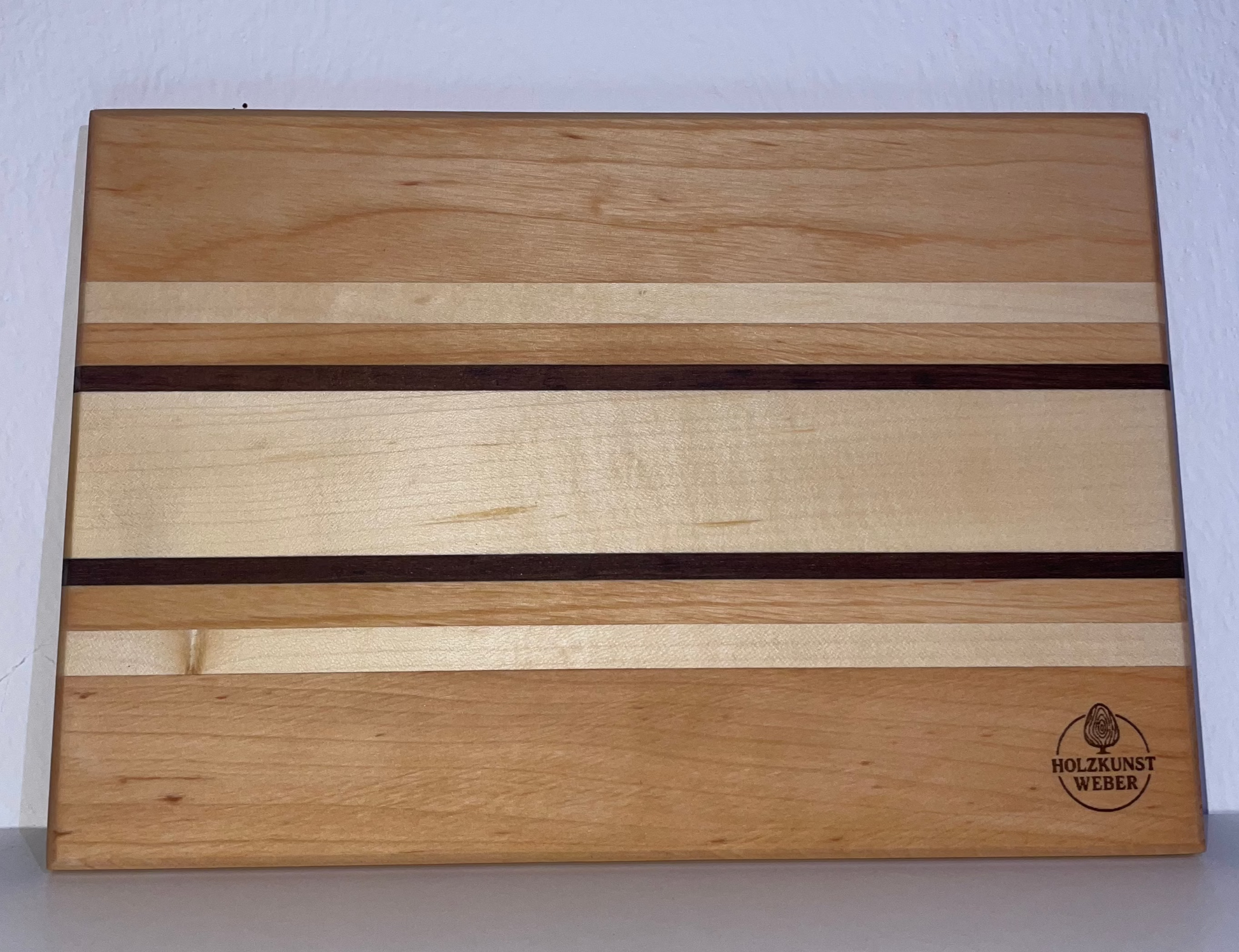 Hochwertiges Jausenbrettchen aus Erlen- und Ahornholz mit dunklen Akzenten aus Mansonia. Maße: 26cm x 17,5cm