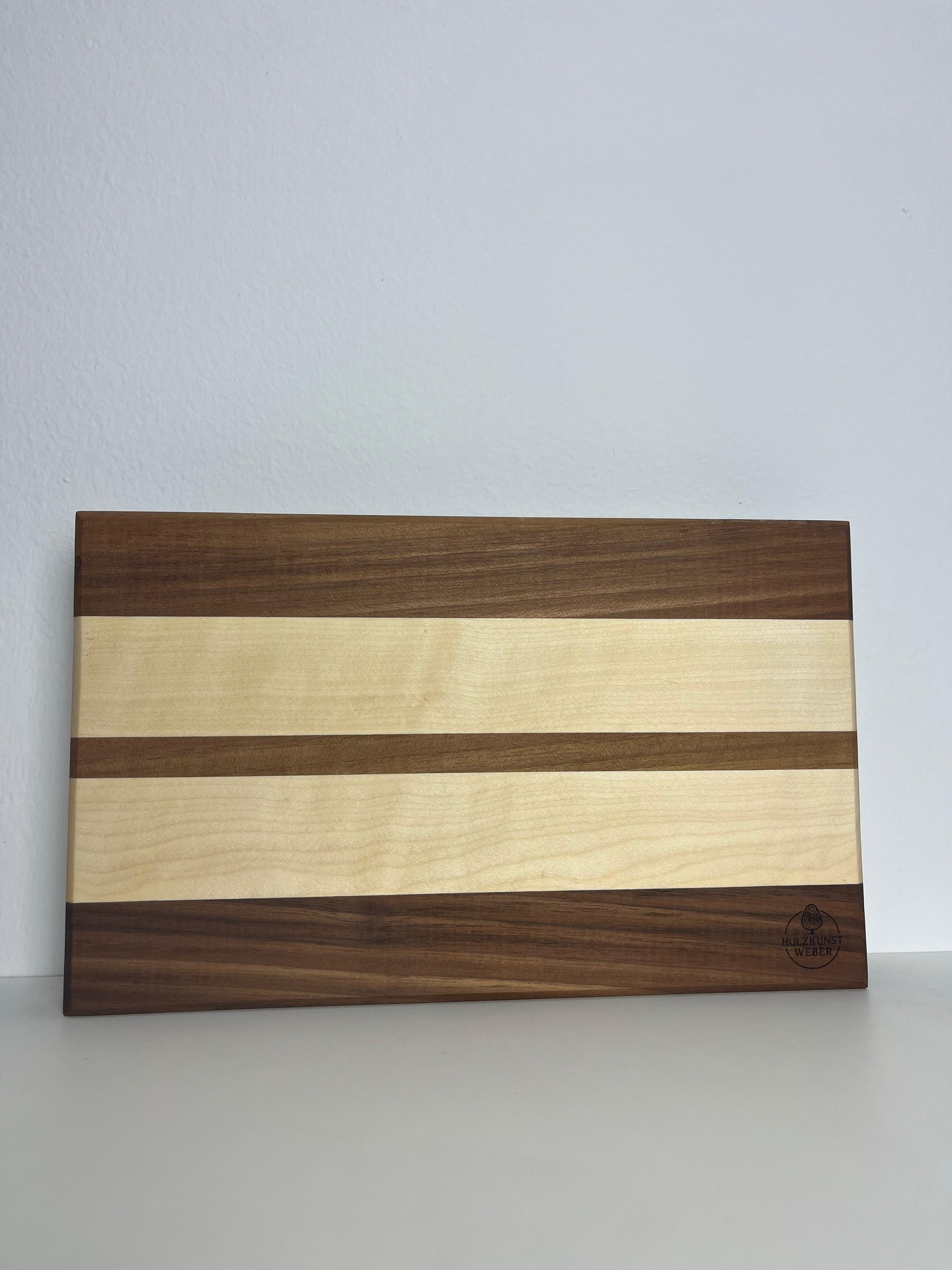 Hochwertiges Jausenbrettchen aus Ahornholz mit dunklen Akzenten aus Nuss.