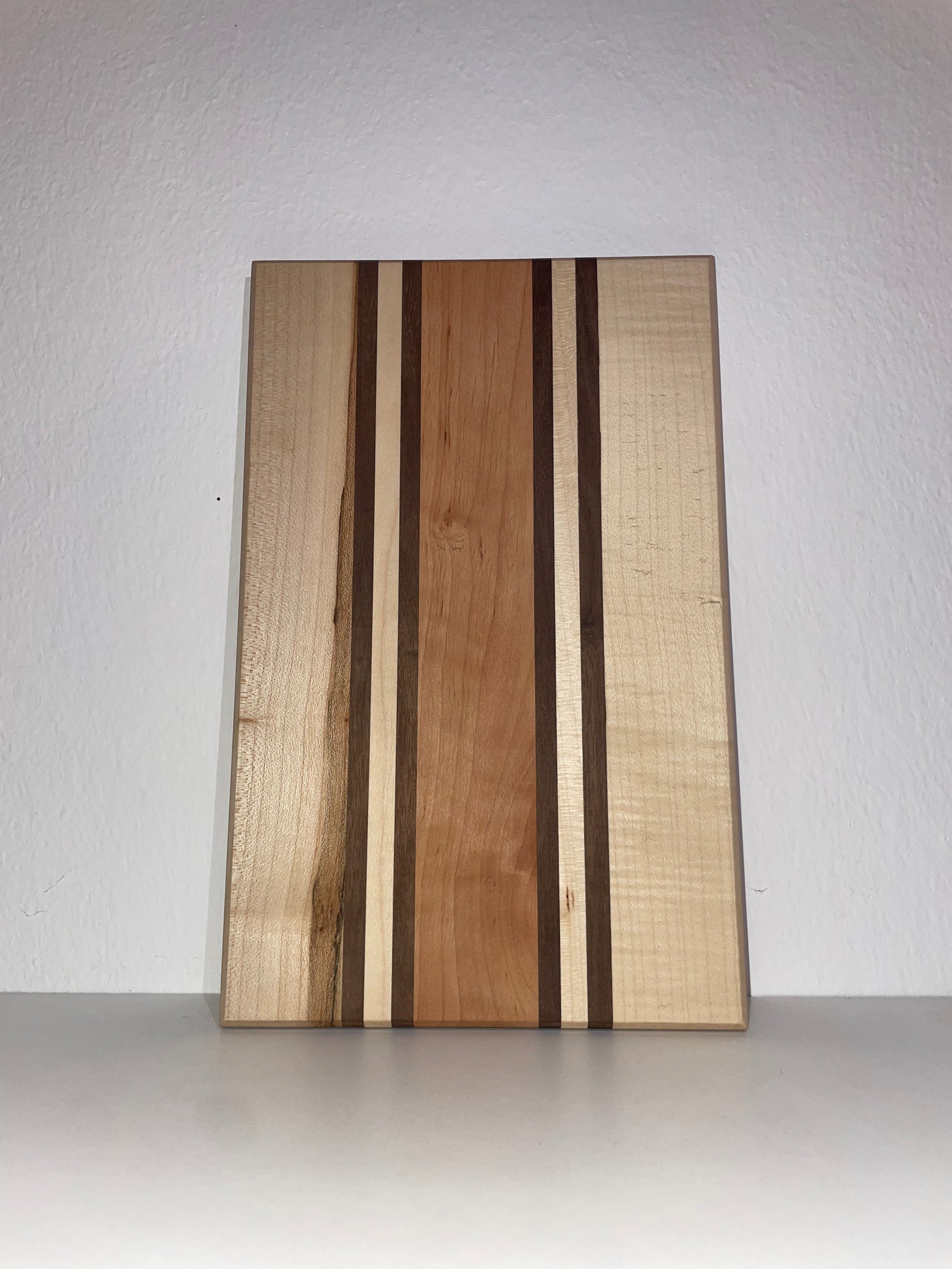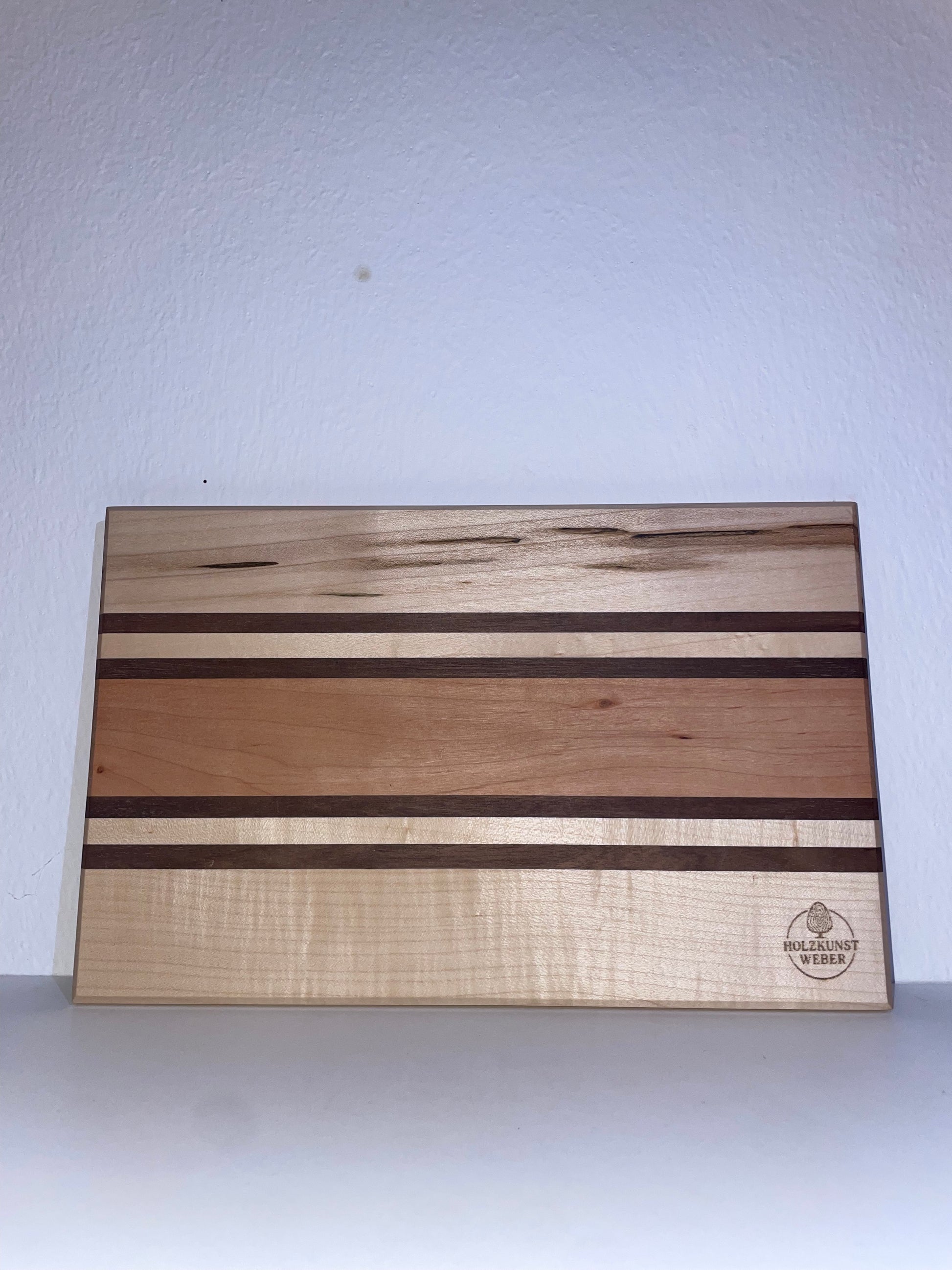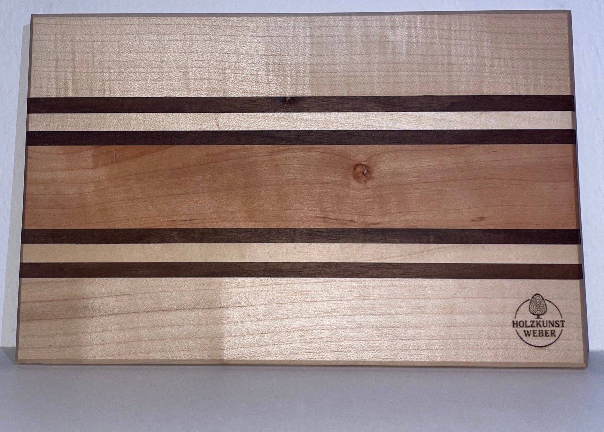 Hochwertiges Jausenbrettchen aus Ahornholz mit Akzenten aus Mansonia- und Erlenholz. Mit kleinen "Holzfehlern". Maße: 26,5cm x 16cm