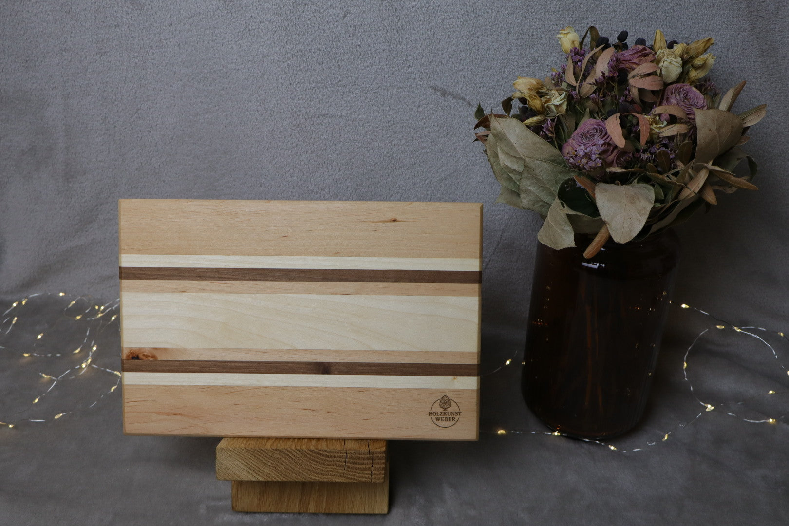 Hochwertiges Jausenbrettchen aus Erlen- und Ahornholz mit dunklen Akzenten aus Nuss.