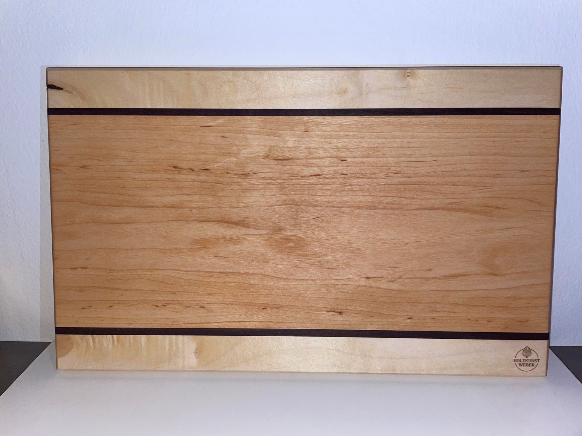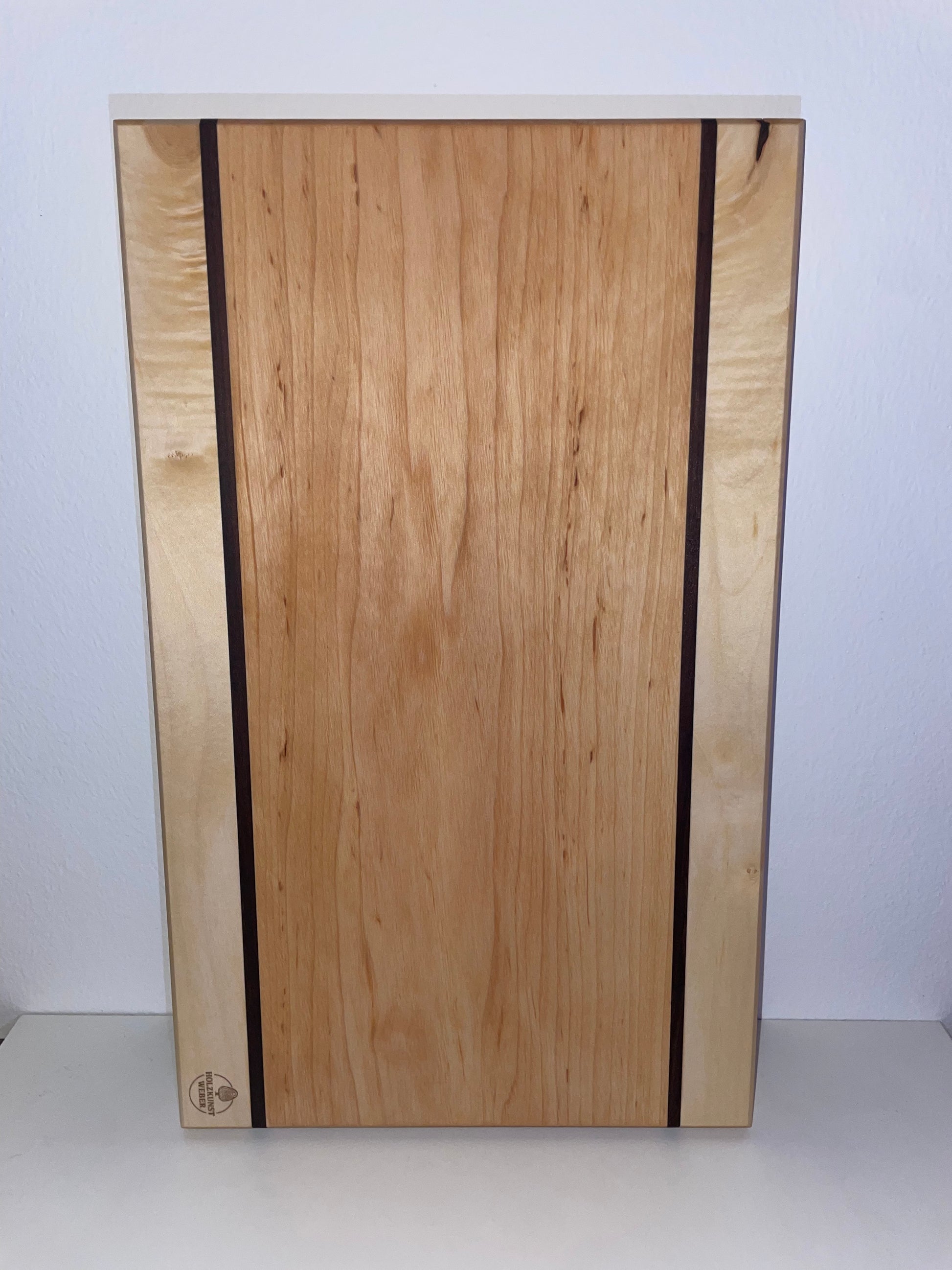 Hochwertiges Schneidbrett aus Erlenholz mit Akzenten aus Mansonia- und Ahornholz. Maße: 46cm x 28cm x 3cm